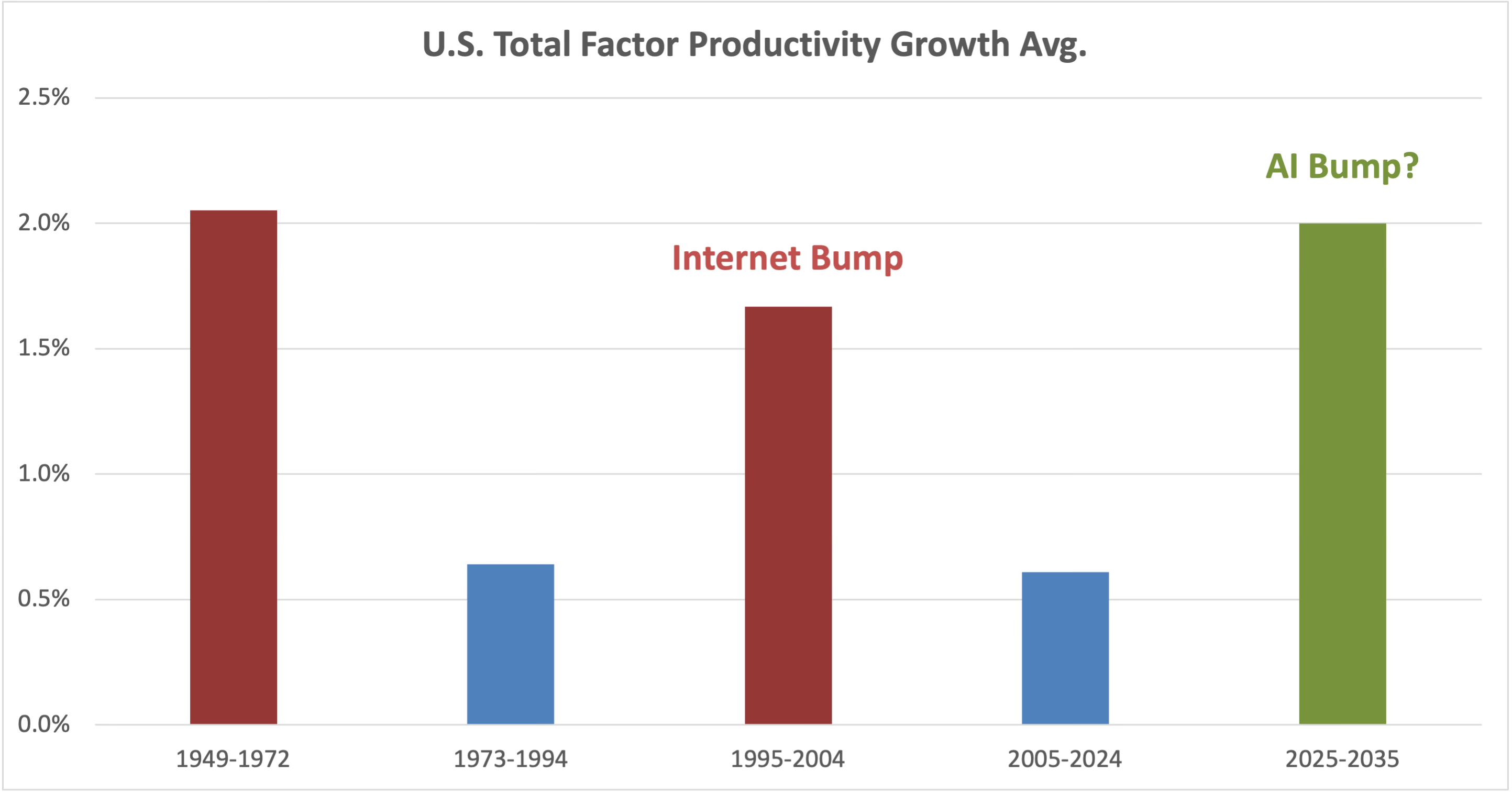 The decade surrounding the Internet boom saw a marked increase in U.S. total factor productivity (TFP) growth—the economic efficiency gains beyond just adding more workers or capital—similar to higher levels seen before 1973. However, it then declined again from 2005 onward back to doldrums levels, which brings us to the present. Now, people are starting to debate a similar potential AI productivity bump unfolding over the next decade.